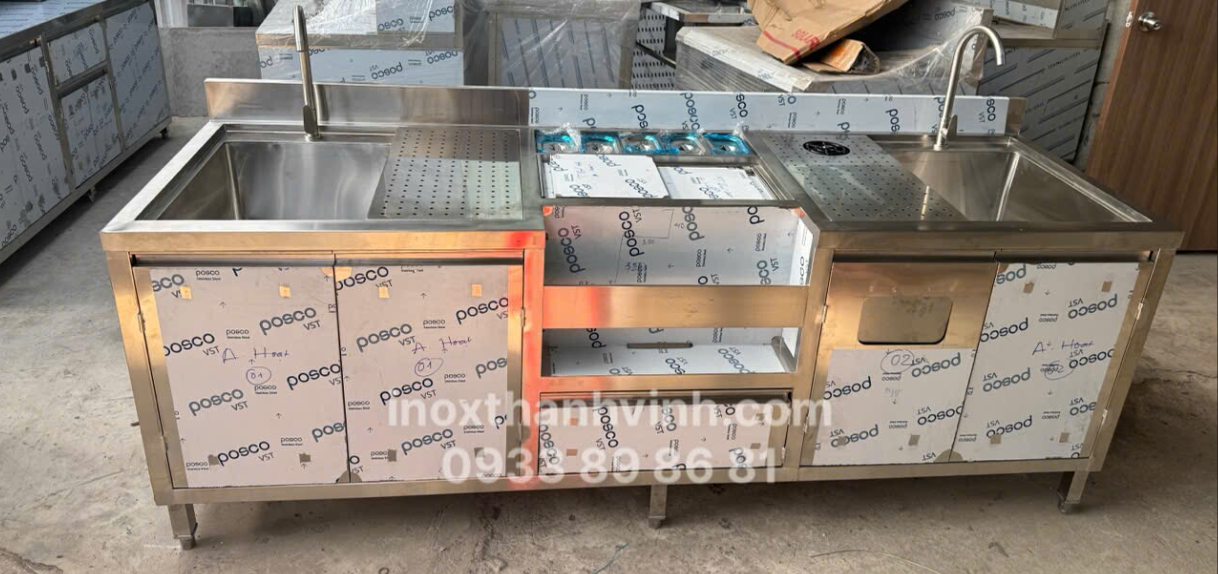 Tất cả quầy pha chế tại Inox Thành Vinh đều được gia công từ inox chất lượng, kết cấu khung chắc chắn, bề mặt dễ vệ sinh và phù hợp môi trường ẩm ướt của khu pha chế. Khách hàng có thể đặt kích thước theo diện tích thực tế để đảm bảo phù hợp hoàn toàn với mặt bằng quán.