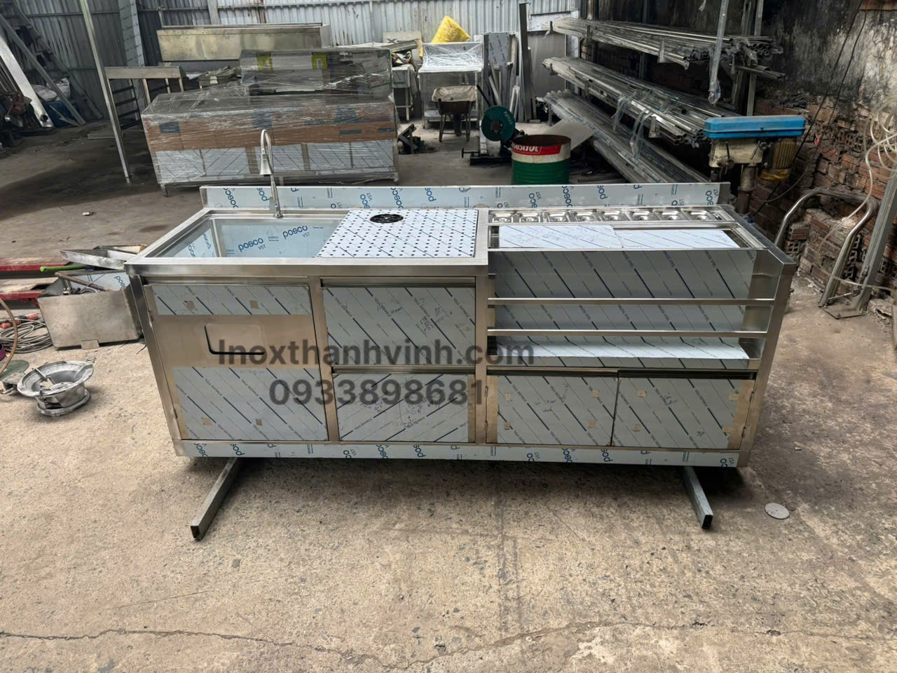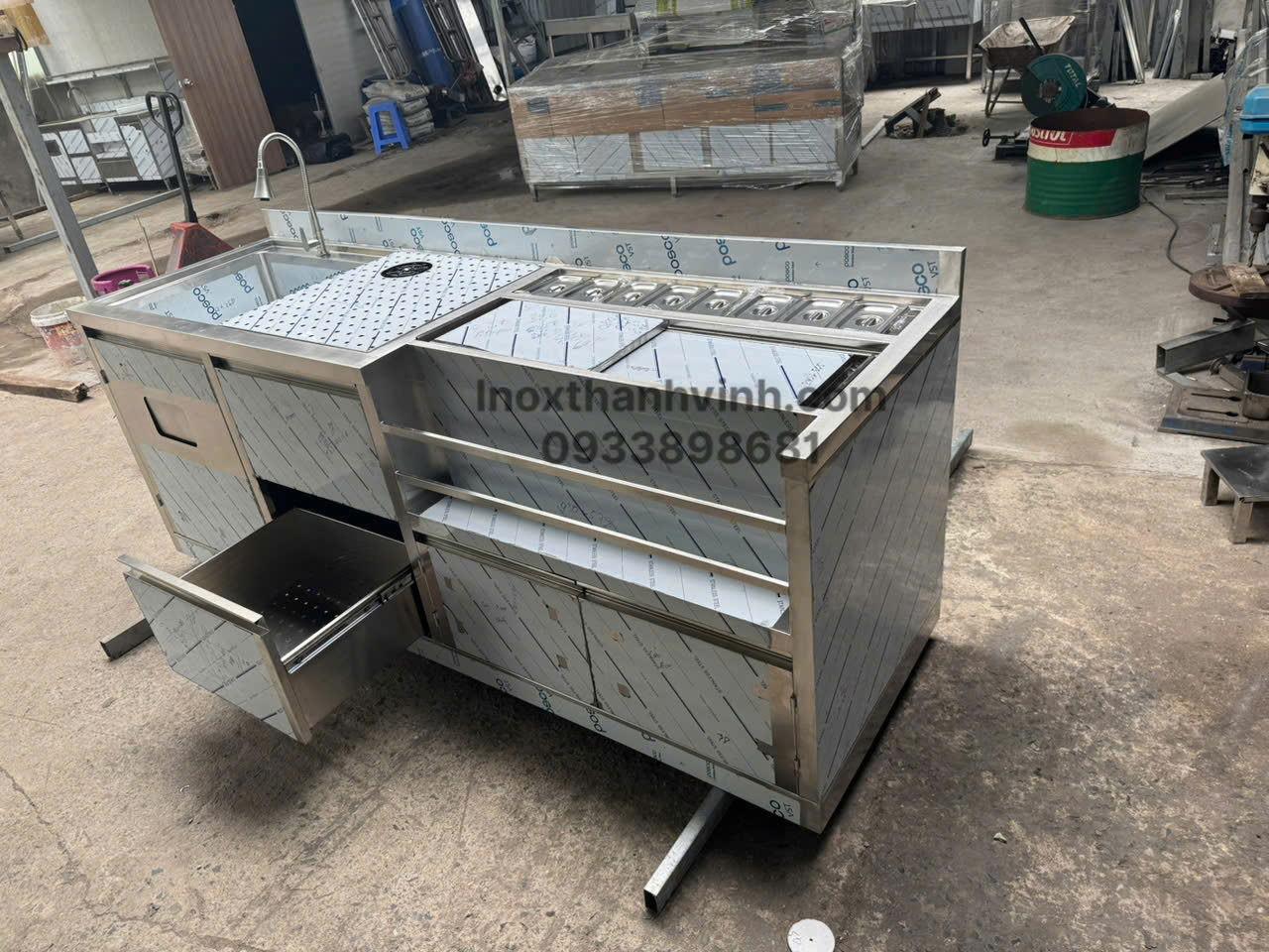 Bên cạnh quầy pha chế, Inox Thành Vinh còn gia công các thiết bị bếp inox công nghiệp như bàn inox, bồn rửa, kệ inox, tủ inox.
